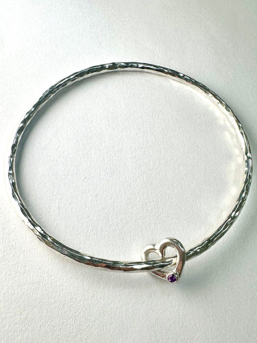 Silver 2mm Hammered Floating Heart Bangle With Amethyst