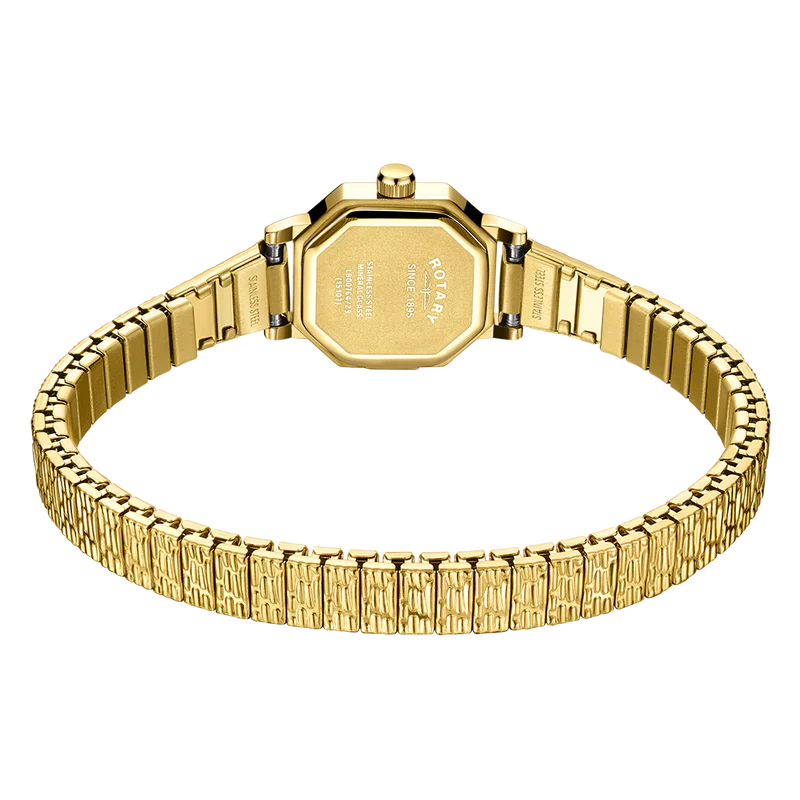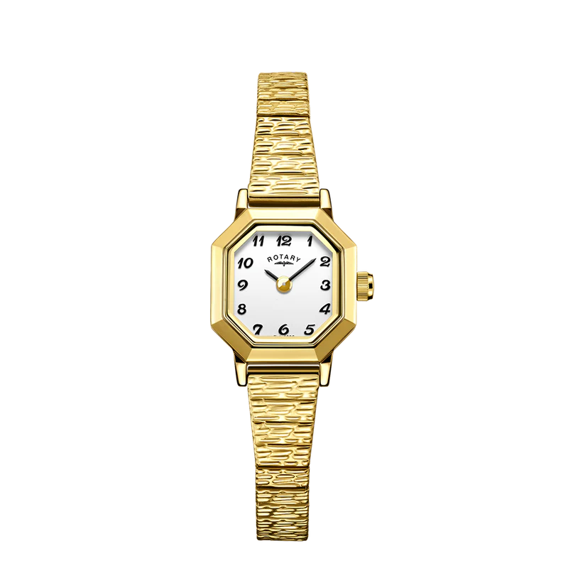 The Rotary Heritage Altera delivers a clean, expandable bracelet with wearability at the core of the design. Featuring an expanding bracelet, this watch comfortably fits without the need for resizing the bracelet. The gold PVD octagonal 17.5mm case houses a quartz movement and is protected by mineral glass. The white dial features applied black numerals and two black hands.