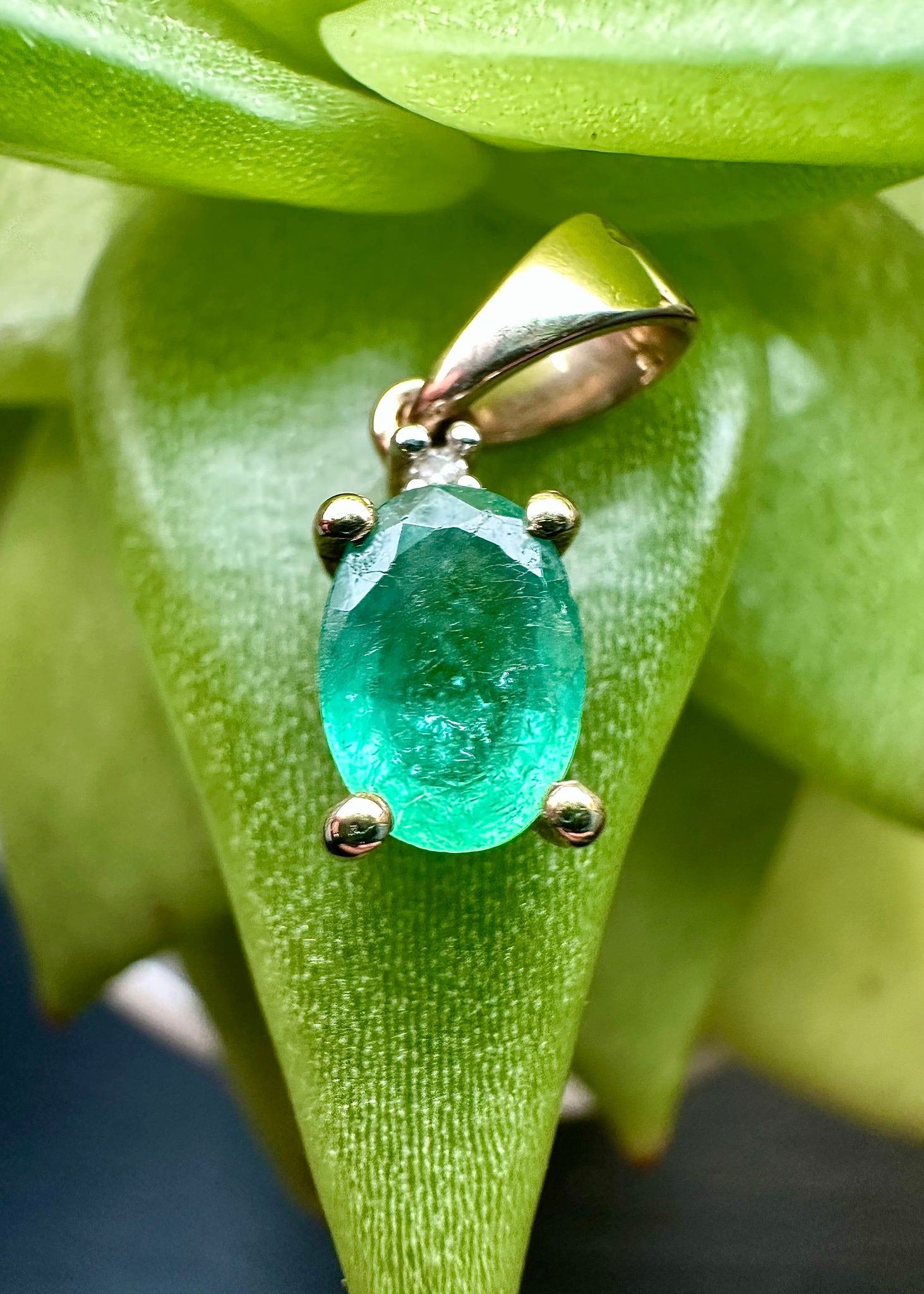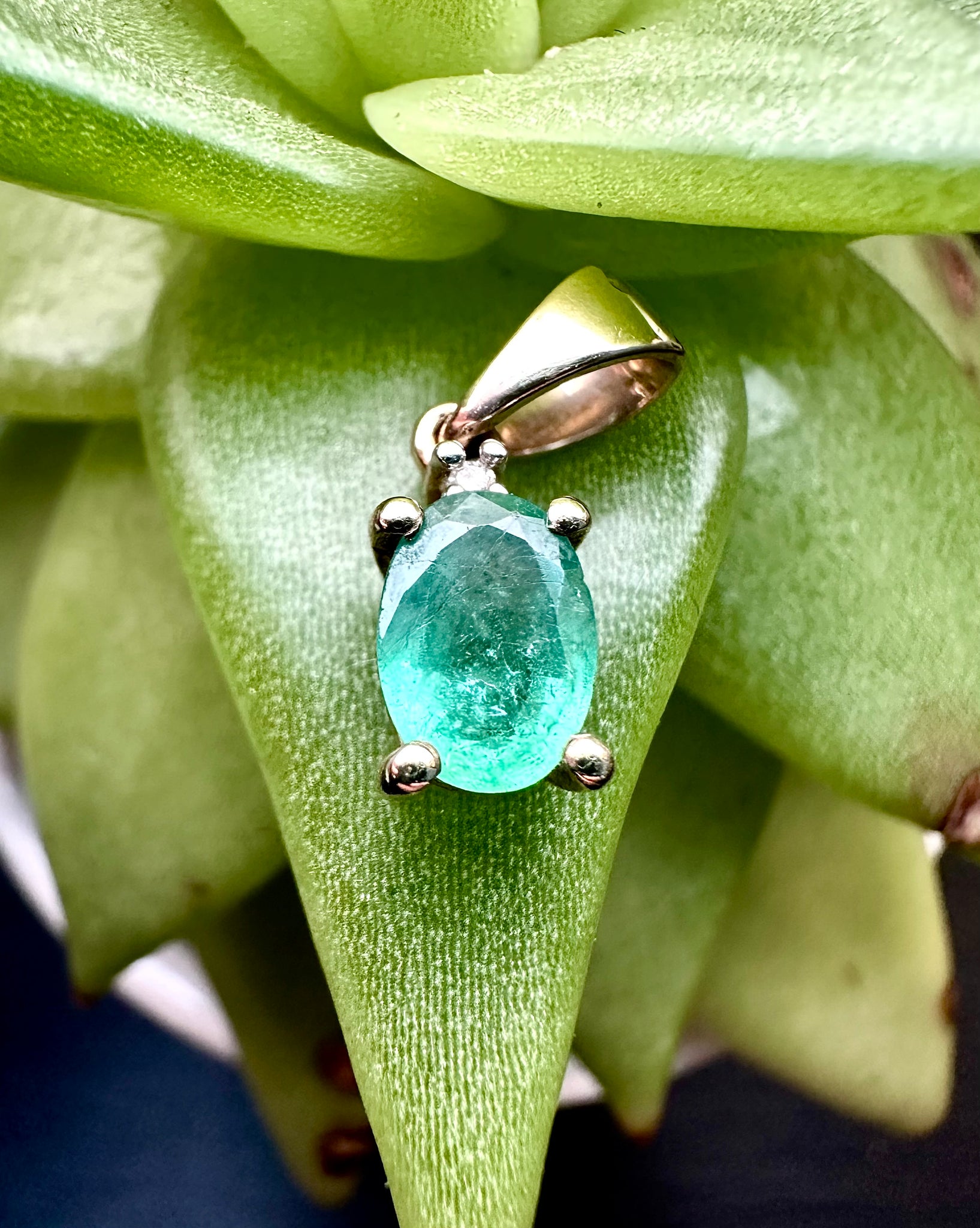 This is a beautiful Emerald pendant with a small round diamond on the top.