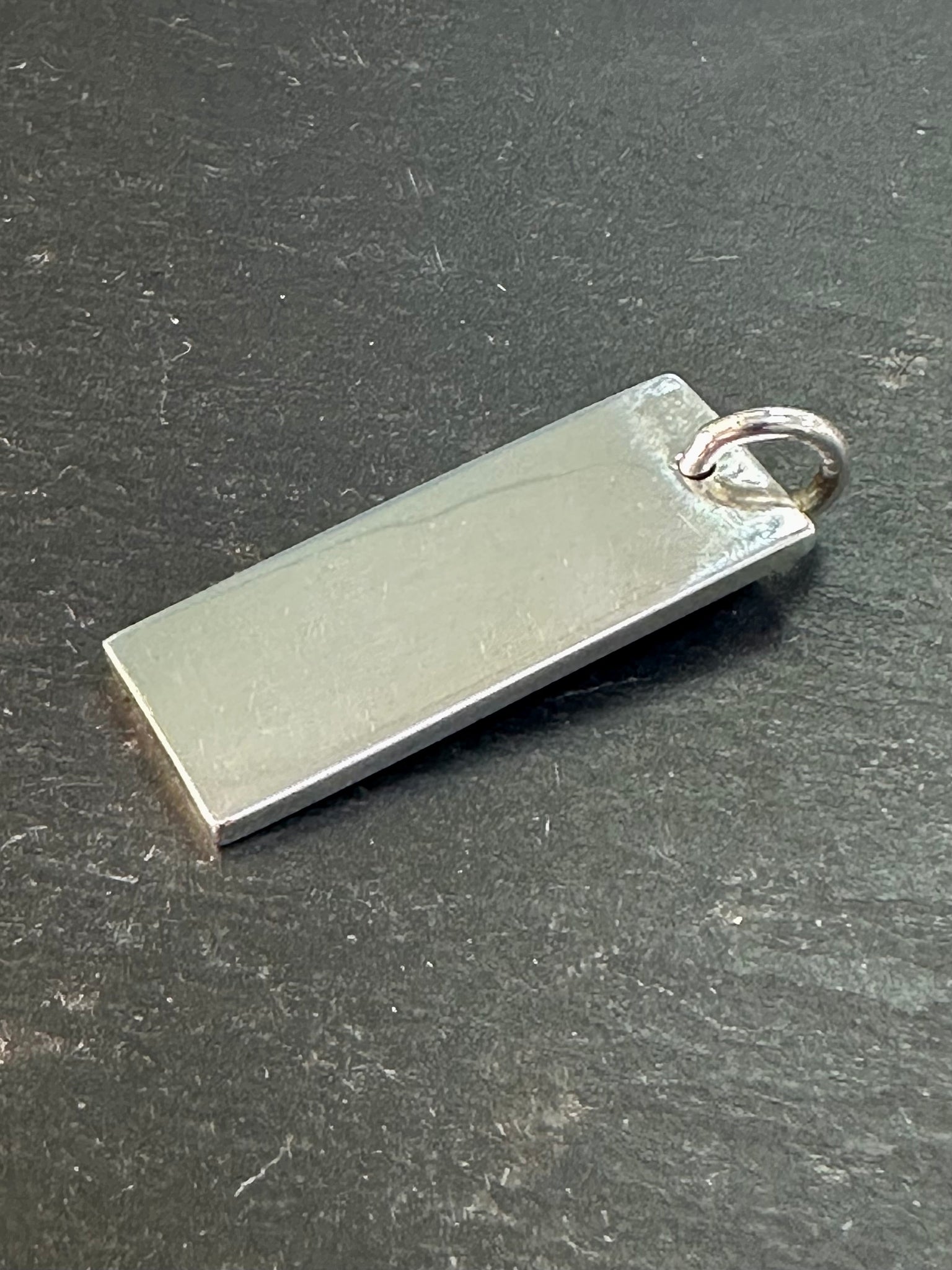 32mm long x 12mm wide rectangle shaped silver ingot pendant, with feature hallmarks