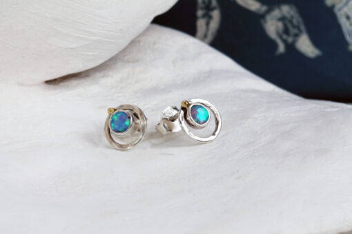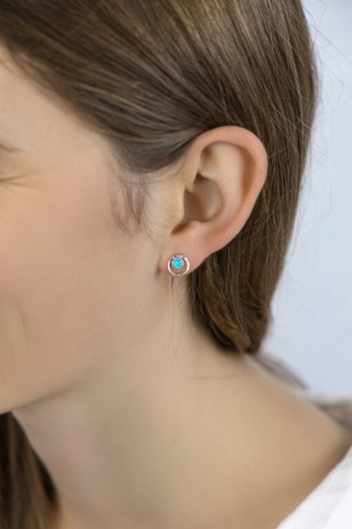 Textured sterling silver 8mm stud earrings set with blue/green opalite.
