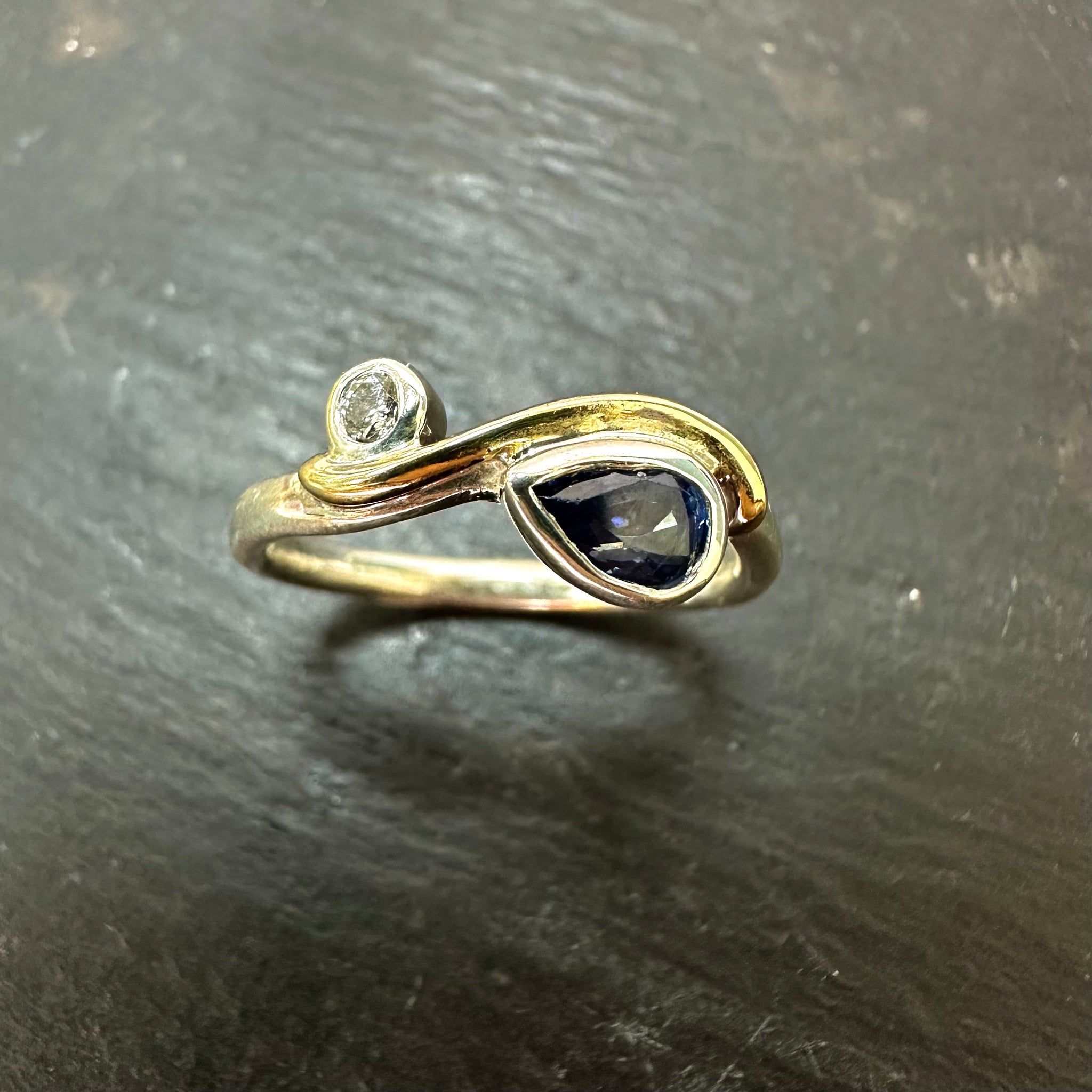 Sterling silver & 9ct yellow gold organic style ring set with a 5mm x 4mm pear shaped Sapphire & a small round diamondMade in store by James Bishop so can be made in any stone combination Size N, can be altered if required2.7 grams