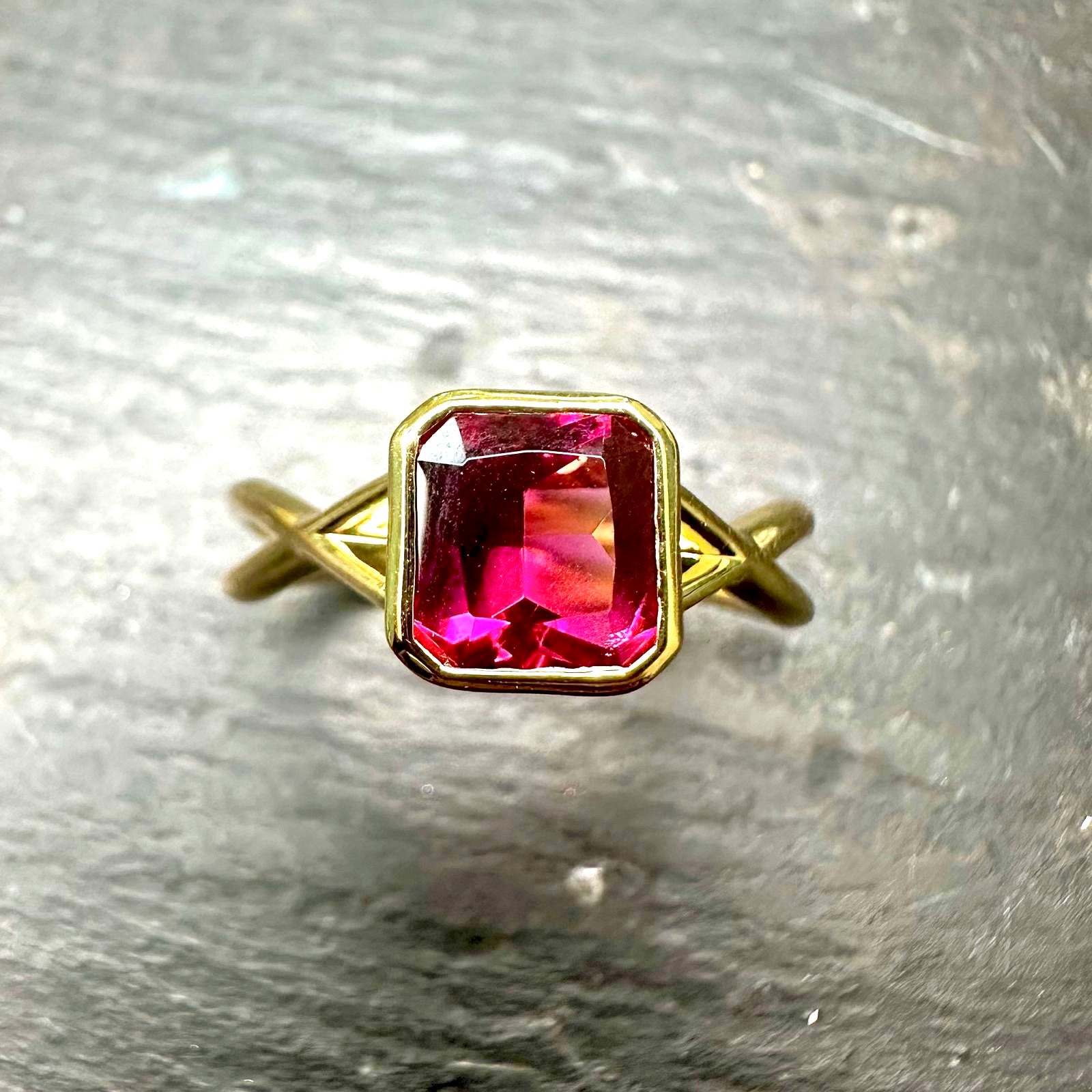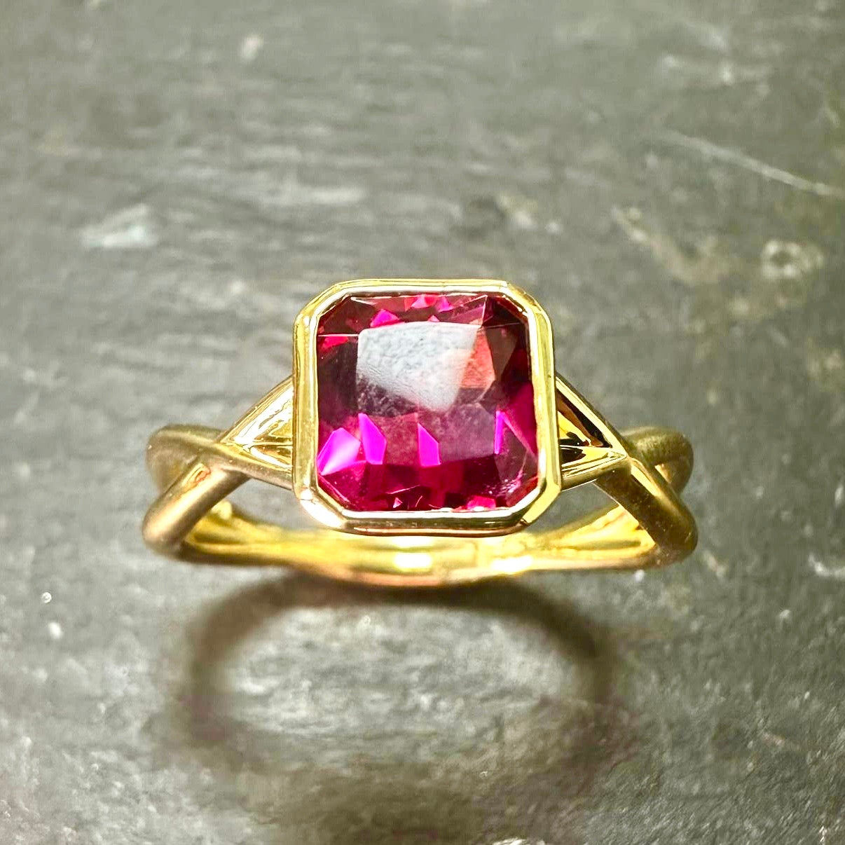 In a fine rubover setting, set in 18ct Yellow Gold which is so striking against the pink