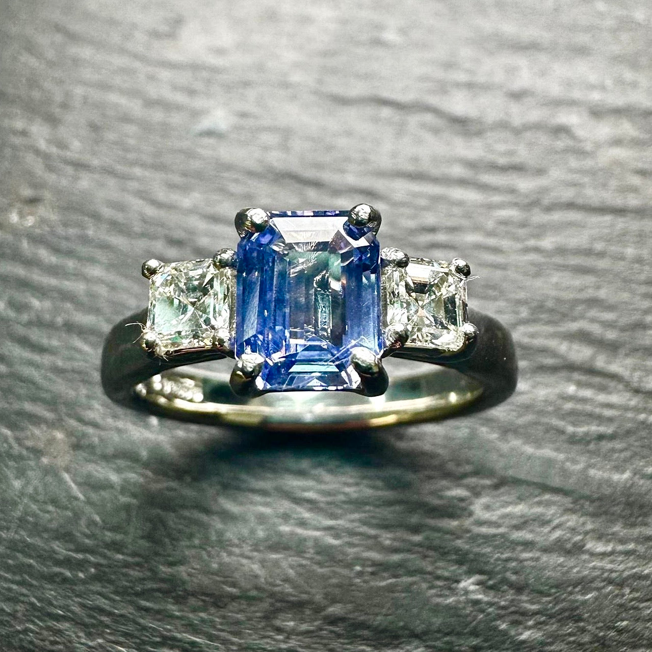 Claw set along side 3.4mm Ascher cut diamonds, 0.45ct total, Colour G-H, Clarity SI